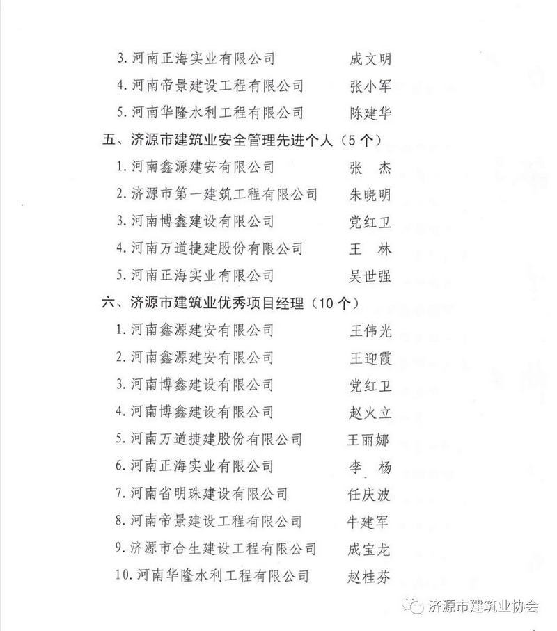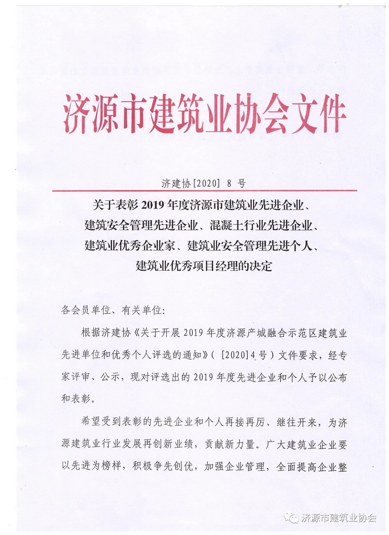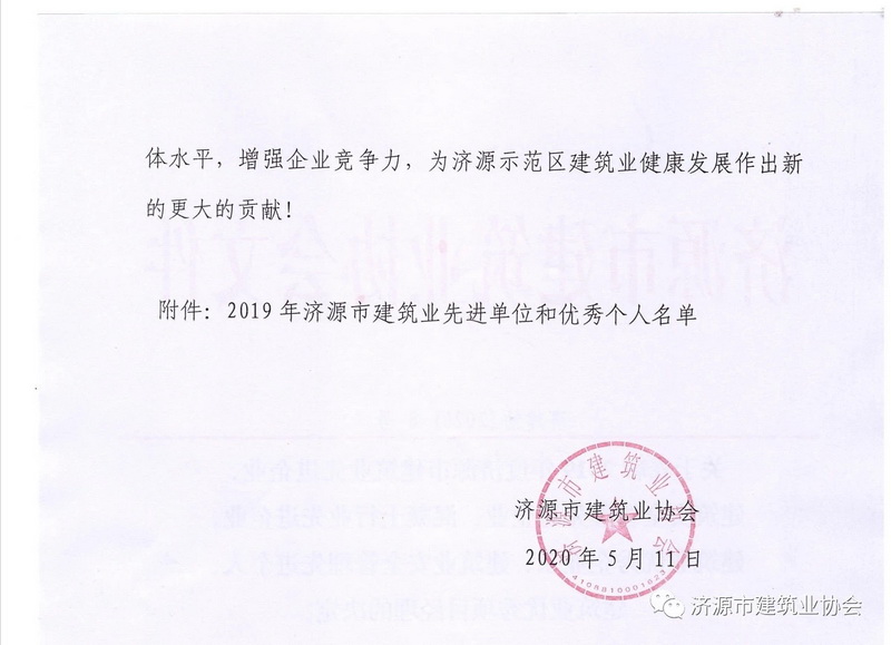 近日,濟源市建筑業協會開展了2019年度濟源產城融合示范區建筑業先進單位和***個人的評選活動,明珠建設在評選活動中脫穎而出,均斬獲佳績。