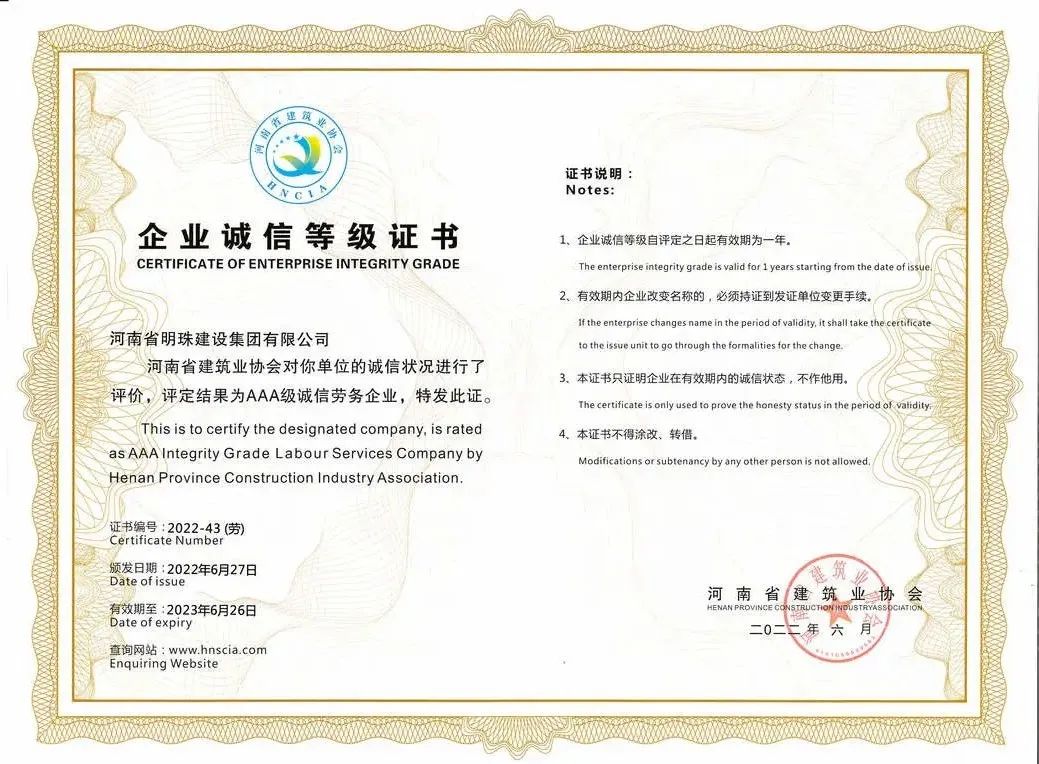 喜 訊 熱烈祝賀河南省明珠建設集團有限公司獲得2022年度河南省建筑業AA***誠信勞務企業榮譽! 公司簡介: 河南省明珠建設集團有限公司位于濟源市高新區科教街濟源遠大實業有限公司四樓,注冊資金10566萬元,是一家集建筑、市政、公路、水利、機電等為一體的綜合性建筑企業。 公司具備防水防腐保溫工程、建筑裝修裝飾工程、古建筑工程、環保工程***承包、城市及道路照明工程壹級;建筑工程、市政公用工程施工總承包貳級;鋼結構工程、公路交通工程***承包貳級;公路工程、水利水電工程、機電工程施工總承包叁級;特種工程***承包、施工勞務等資質。近幾年來承接多項大型房建、公路、市政及水利等項目,通過了質量、環境、職業健康安全管理體系認證,連續多年獲得省、市“先進單位”、“先進企業”等榮譽稱號、QC成果等獎項。 公司一直秉承“質量求生存、信譽求發展、管理求效益、服務拓市場”的經營理念,“勇于開拓、真抓實干、銳意進取、創造精品”的企業宗旨,“團結奮進、開拓創新、誠實守信、追求***”的發展理念,為促進和諧社會發展貢獻力量。